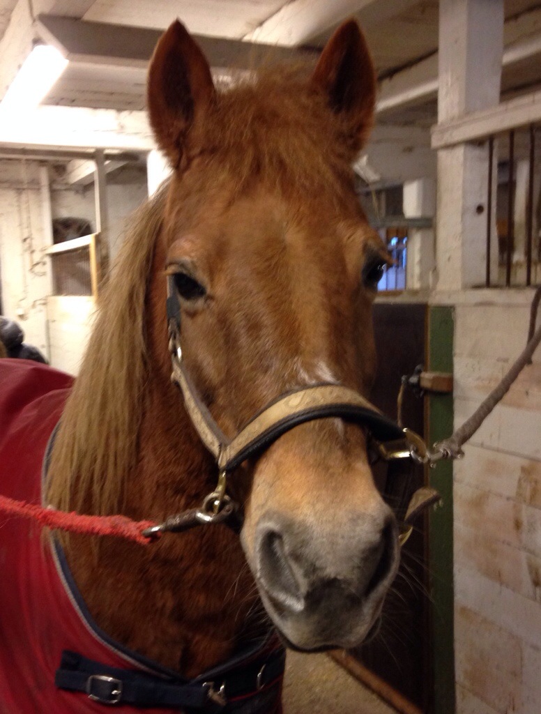 Igår mötte jag upp min moster och besökte hennes Brumman (på bilden). Tyvärr var det både spöregn ute, ont om tid och en hel familj på tre vuxna, två barn och två hundar + jag och moster i det lilla stallet på fyra boxar – med andra ord ingen direkt kvalitetstid att lära känna mosters häst. Men det får bli fler gånger!