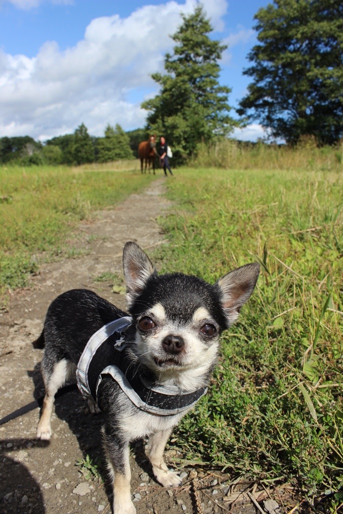 Ungefär halvvägs tog vi paus och åt medhavd matsäck. Leon var nöjd med allt gott gräs och nosademig också nyfiket i håret (?). Vi provade lite tricks (visar dem en annan dag) och vandrade vidare.