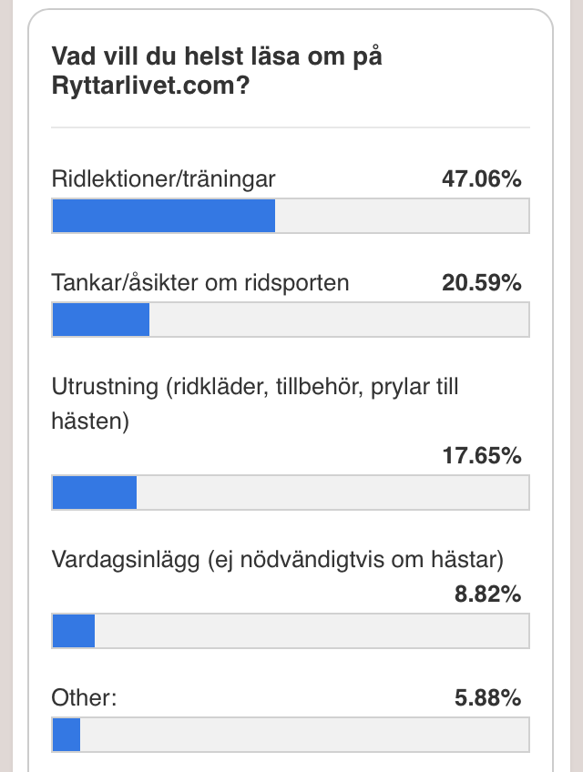 Så här ser resultatet ut just nu när jag skriver detta inlägg och det är tydligt att ni är här för att läsa om hästar och ridsport! Ni önskar er ungefär 90% hästrelaterat och 10% vardagsinlägg.