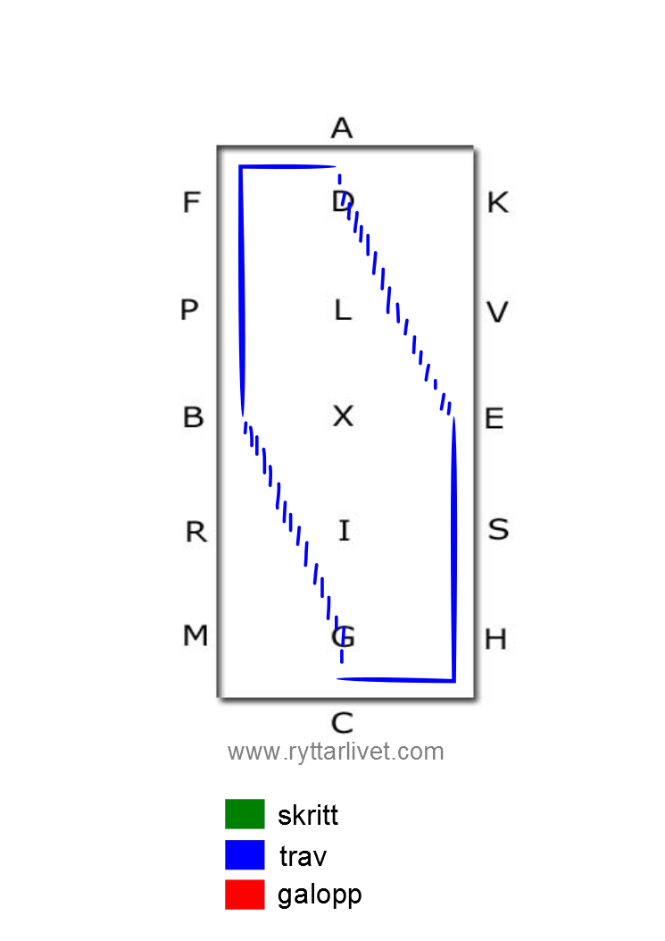 Efter detta började vi trava och så skulle vi börja med en väg som jag tror hette förlängda hörnpasseringen eller hörnlinjen? Man red längs fyrkanten och vid A red man skänkelvikning till E och vid C till B.
