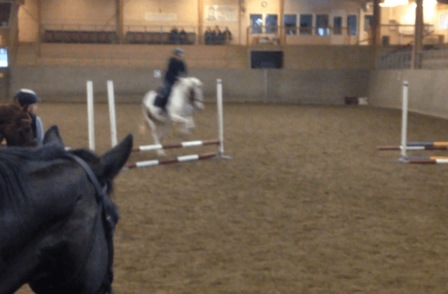 Så totalt var upplägget/banan: trava eller galoppera till första hindret, hopp, landa i höger galopp, bryt av till trav. Trava fram till andra hindret, hopp, landa i vänster galopp. Galoppera till sista hindret, hopp, landa i höger galopp. Bryt av till trav. Slut.