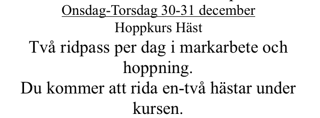 Jag har anmält mig till en hoppkurs vid nyår. Känns superskoj och utmanande! Jag har ju bara hoppat två-tre gånger och tyvärr missar jag enda hopplektionen den här terminen så nu unnade jag mig detta. Peppad till tusen!