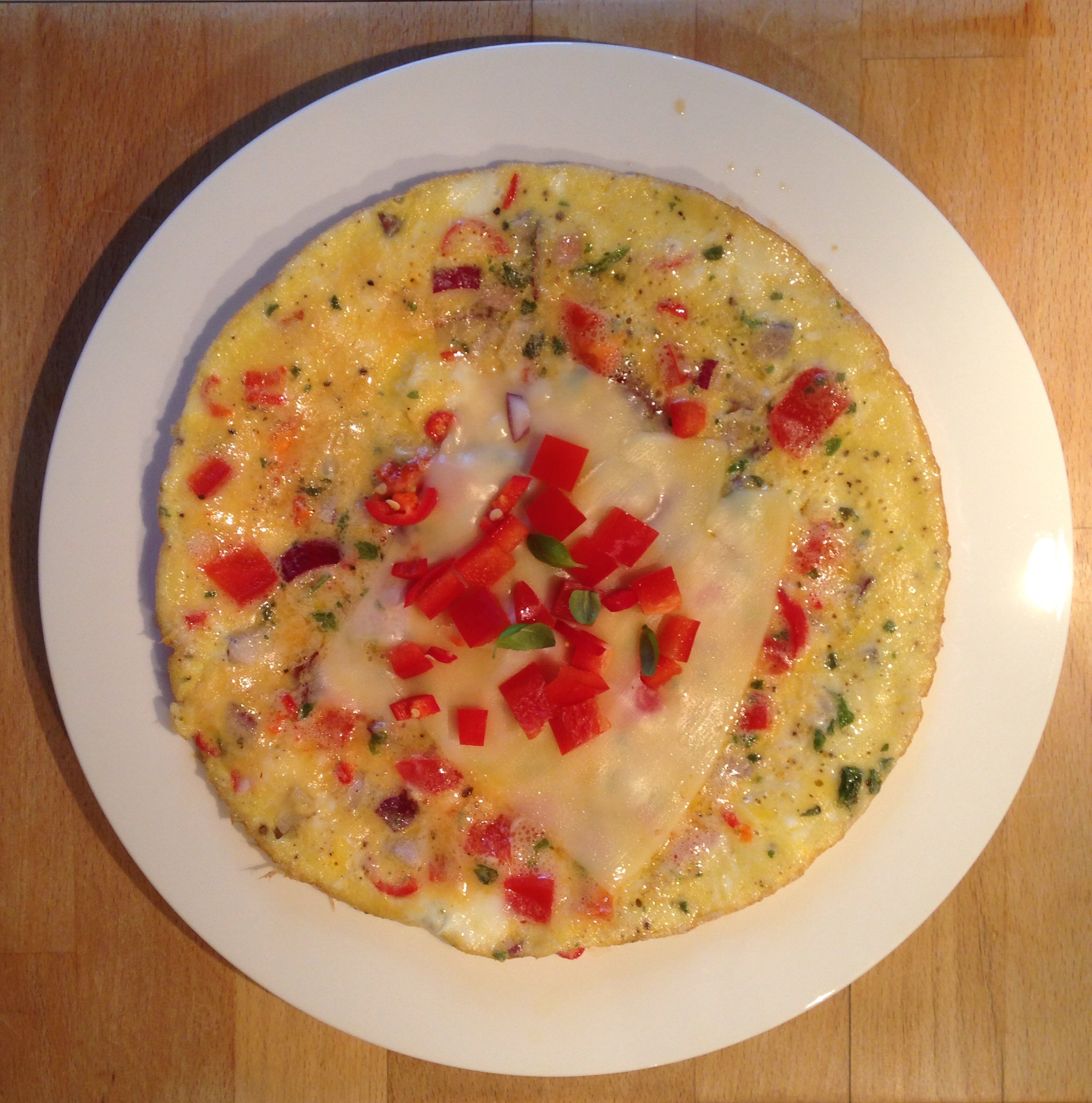 Stek omeletterna i smör eller olja. När de är klara att serveras, lägg på ett par ostskivor och strö på lite paprika och chili.