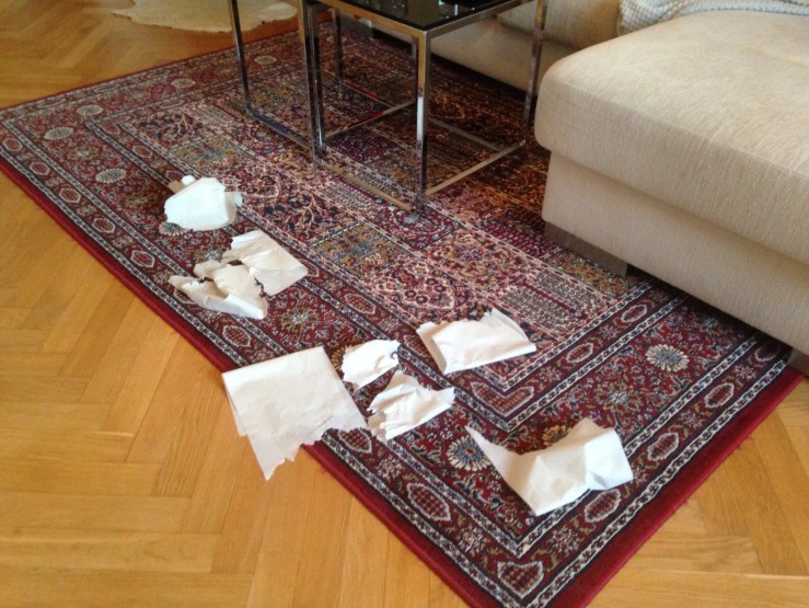 …Sintra skulle ha blivit magsjuk igen. Hon väckte mig varannan timme för att gå ut och bajsa. Sista gången orkade jag inte och då blev det mattan istället… Suck! Lesson learned. På jobbet igår hann hon inte ens med att säga till utan det bara sprutade. Happ. Blev till att skrubba och gå hem. Och så här såg det ut efter natten till idag onsdag: