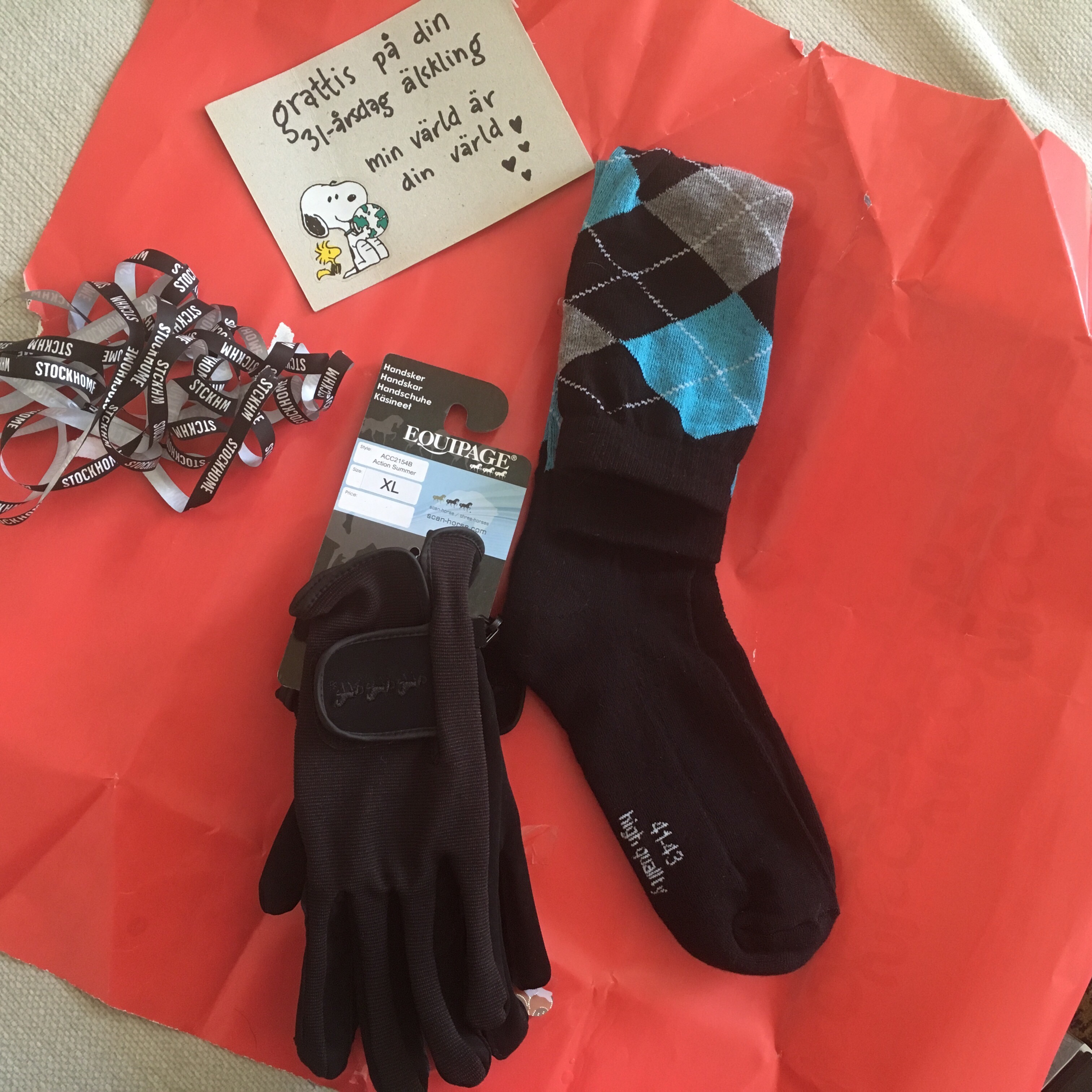 Idag på hans födelsedag fick han ett paket med ett par ridhandskar, ridstrumpor och en intensivkurs för vuxna nybörjare! Tyvärr dröjer det till augusti innan den drar igång men den som väntar på nåt gott….!