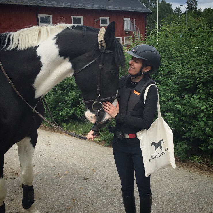 Crunchie var, som 90% av ridskolehästarna enkel och okomplicerad att göra iordning. När jag väl satt upp så kändes det dock som att sitta på en elefant – jag kom ju så högt upp! Nu gillar ju jag höga hästar så det gjorde såklart inget. Jag valde ändå att ta på mig säkerhetsvästen denna lektion eftersom jag inte ridit hästen förut eller kände till honom riktigt. Bäst att ta det säkra före det osäkra!