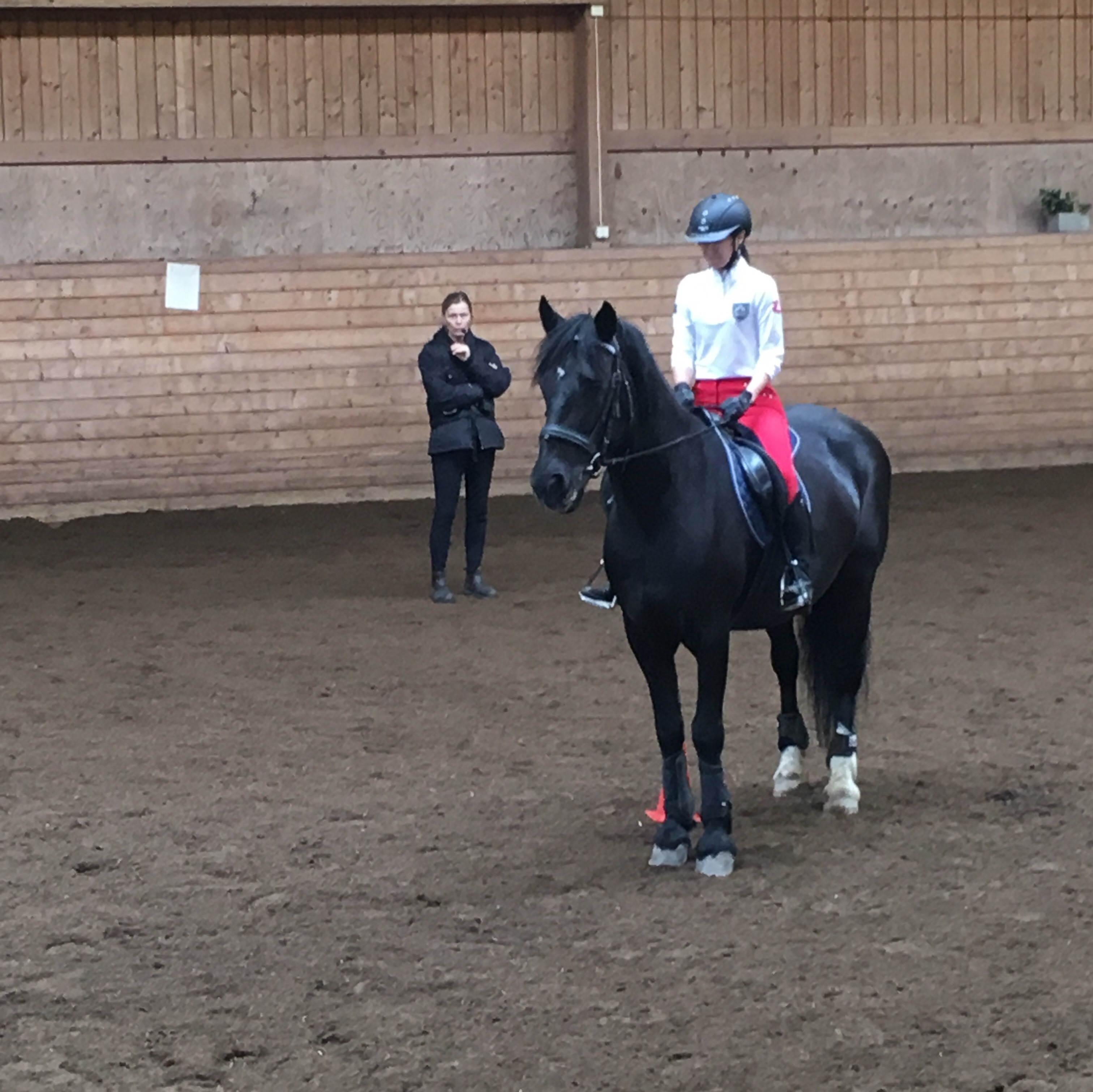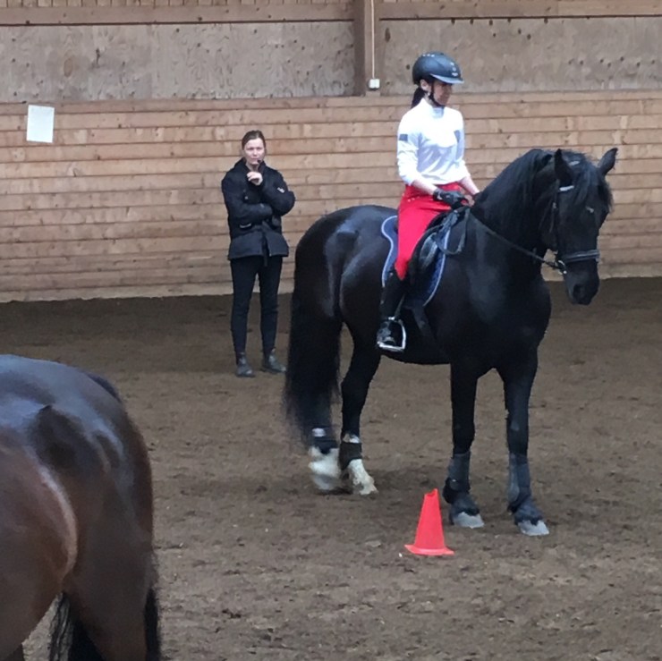 Efter den sedvanliga uppvärmningen så fick vi fördela oss på A- och C-volten där koner var utställda och vi skulle rida rakt mellan dessa och svänga så tätt på som möjligt. Här gäller det att använda ytterskänkeln på rätt sätt. Därefter fick vi testa att göra halt vid konen, ställa lätt inåt, flytta bakdelen utåt (så vi hamnar i den nya linjen), halt igen och sedan rida rakt fram till nästa kon. Men en häst som är framåt och inte gärna vill stanna så var det en utmaning till en början men det givk ändå okej tycker jag.