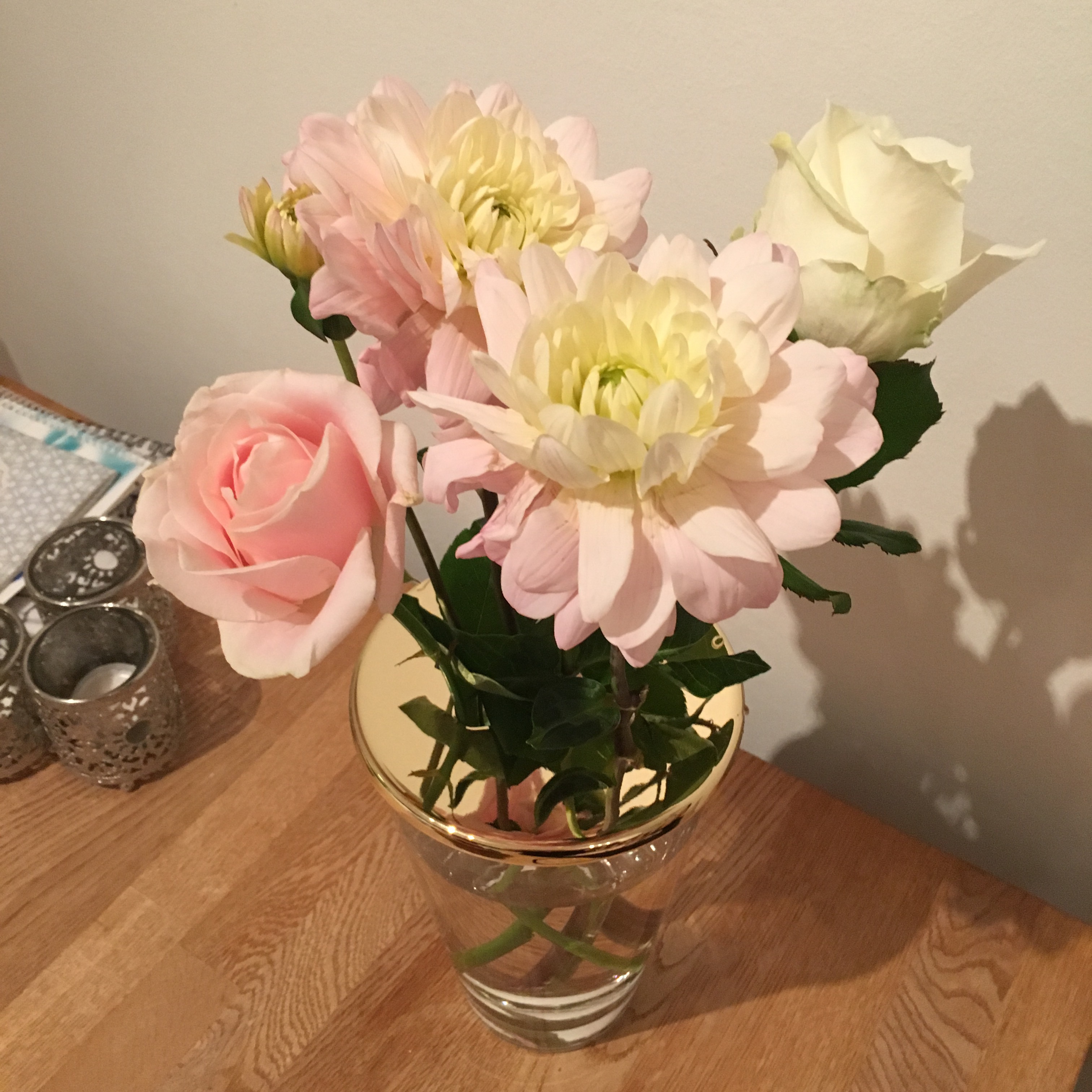 Igår åt vi hemgjord pizza och tittade på semesterbilderna. Den fina vasen (och blommorna) fick vi av våra grannar i bröllopspresent, superfin med bara ett fåtal stjälkar i!