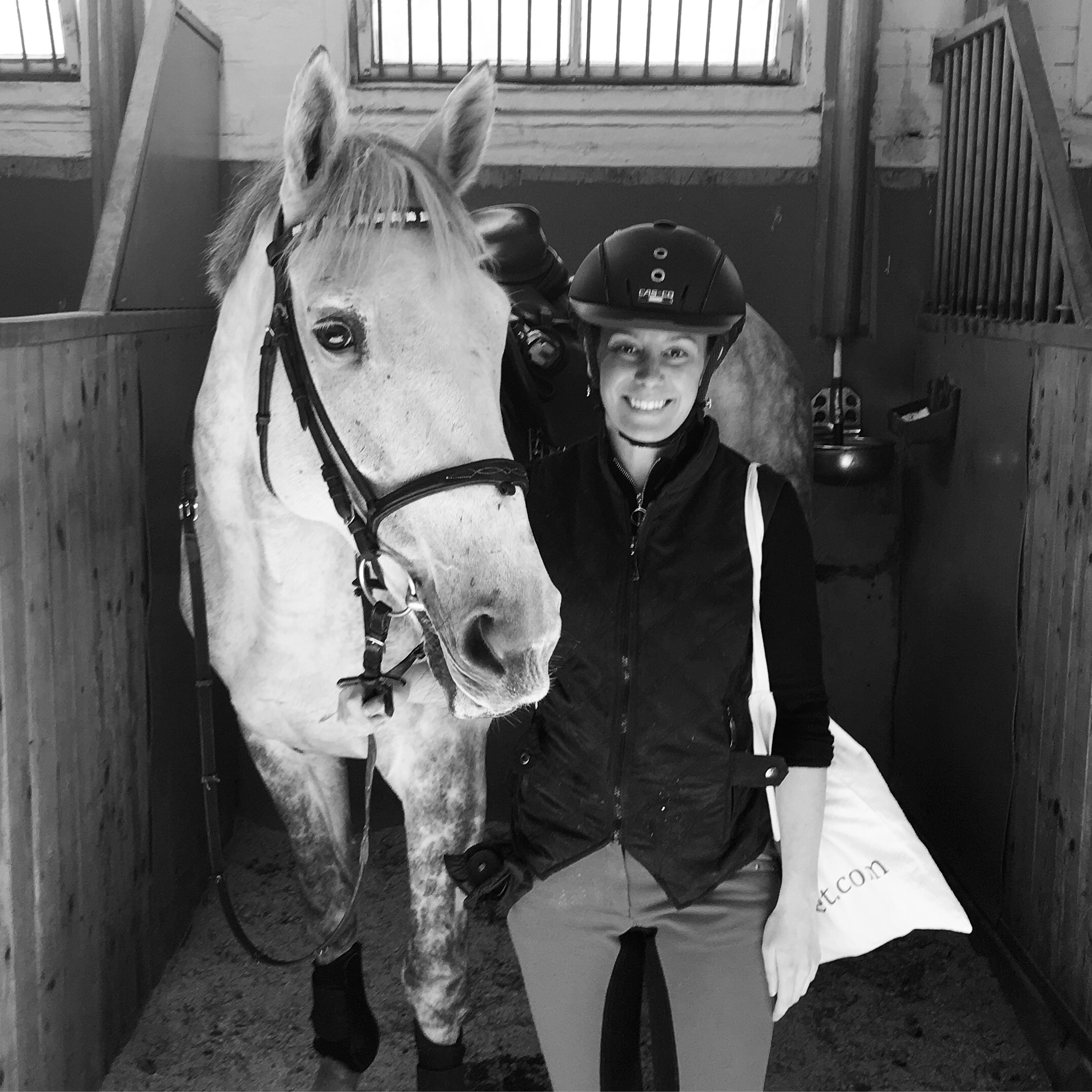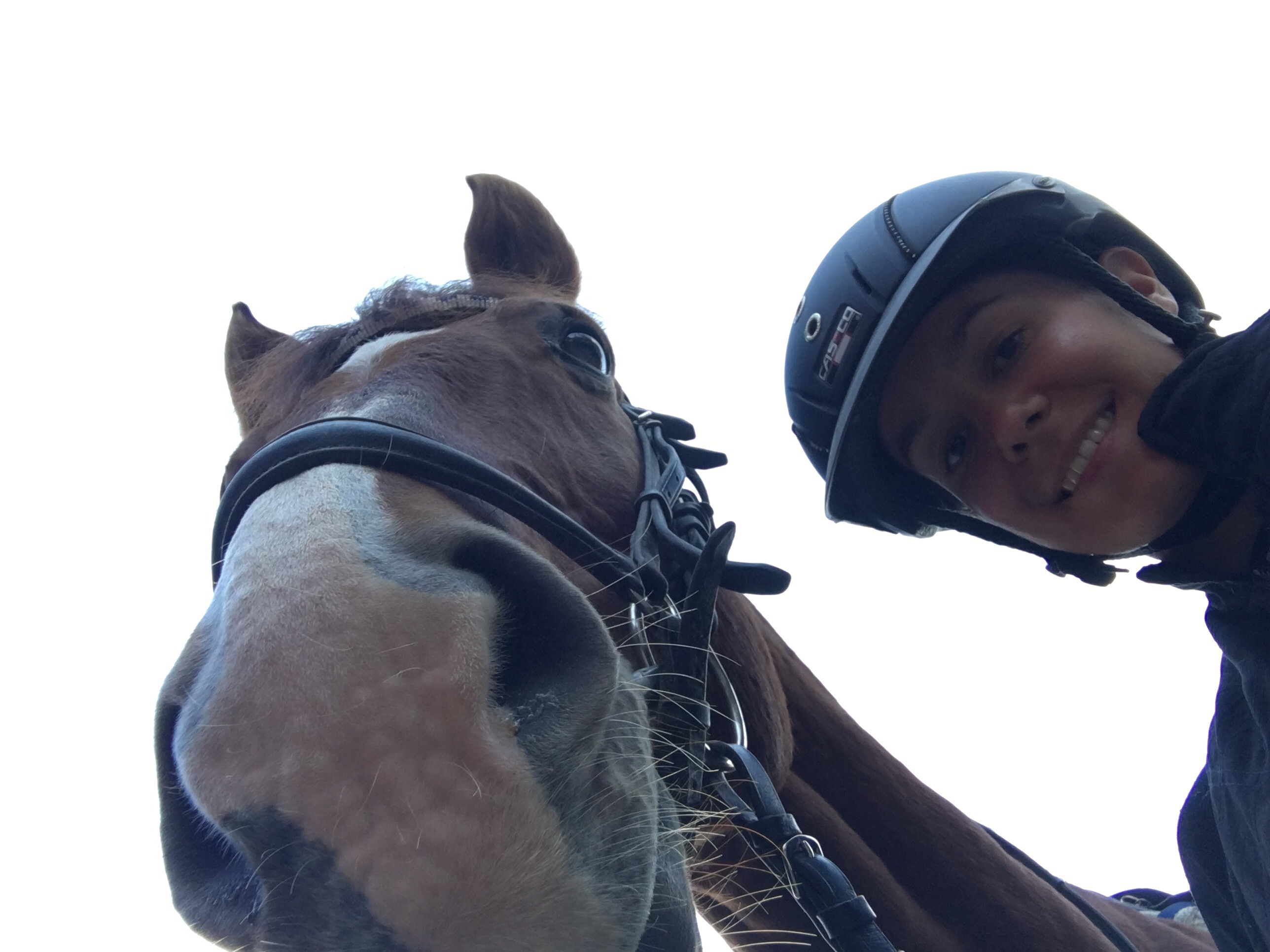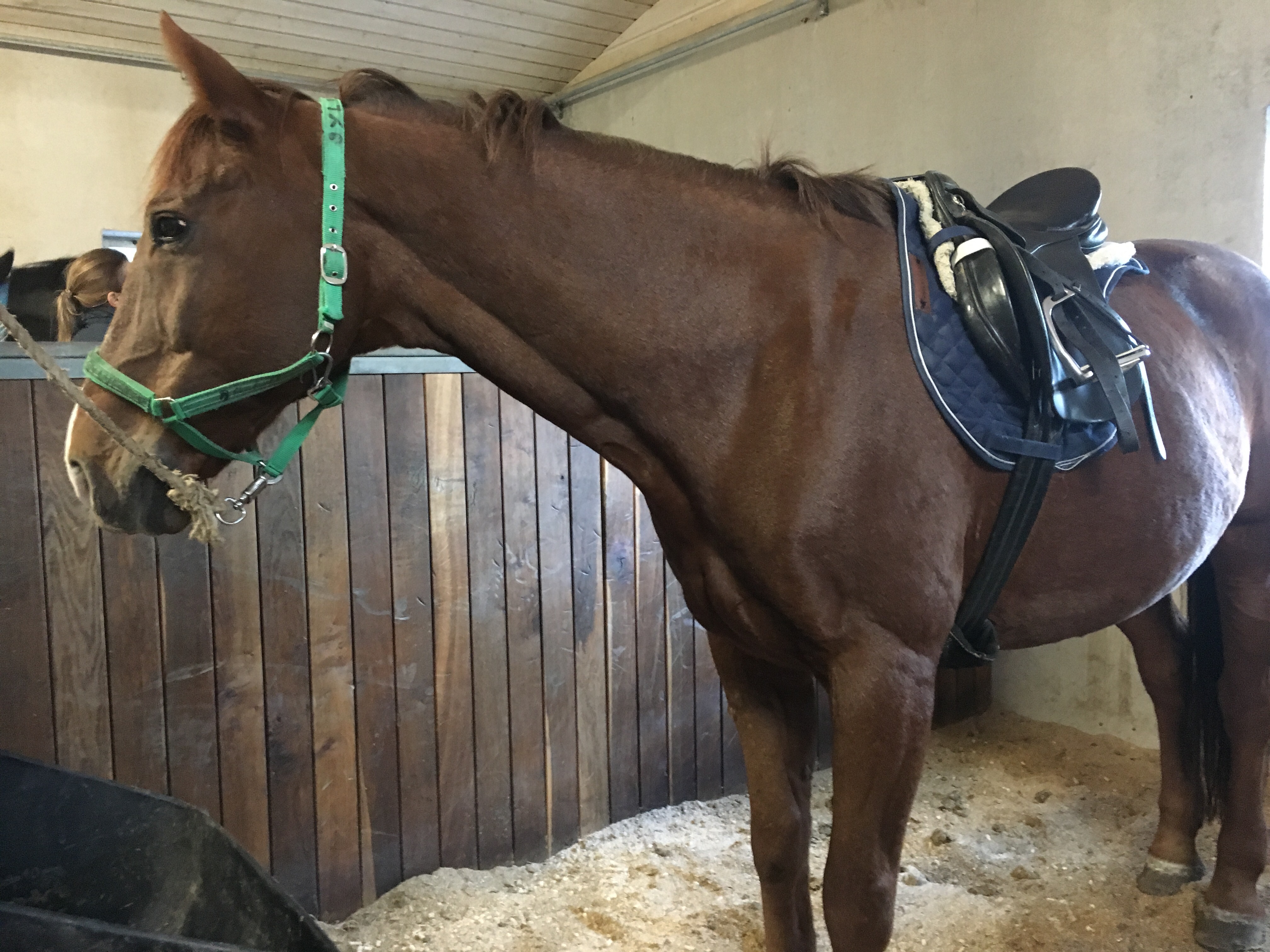 Tasset är en av ridskolans hoppstjärnor. Hon är en liten häst som älskar fart och skutt. Hon blir lätt stark och springig så utmaningen är att få henne lugn och avslappnad utan att ta i tyglarna hela tiden. Hon är nämligen känslig i munnen och drar man henne i munnen så blir hon motsträvig och rockar med huvudet åt alla håll och kanter. Jag har ju ridit henne ett par gånger så nu vet jag att det är en väldigt mjuk men stabil hand hon behöver och att man rider mer med resten av kroppen och mindre med händerna. Under den här lektionen travade vi över bommar på böjda spår och uppgiften var att verkligen hamna i mitten av bommarna så det gäller att med skänklarna lotsa hästen rätt. Det var plättlätt i vänster varv men i höger varv föll hon ut rejält så där gällde det att vara beredd INNAN hon flöt ut och möta upp. Timing is key!