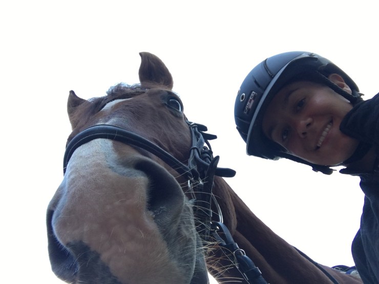 När vi väl kommer in i ridhuset så står där en hel hoppbana uppställd och jag tänker ”VA?! Ska vi HOPPA??!?”. Men nej, det skulle vi inte. Det råkade bara vara så att vår timme låg precis i pausen i en hoppkurs denna dag. Således red vi en dressyrlektion på en hoppbana. Det var tungan rätt i mun som gällde när man skulle hålla reda på sig själv och sin häst, de andra och alla hinder. Vi fick ta små och stora volter och serpentiner mellan hindren och utnyttja de ytor spm fanns. Jag kände efteråt att jag varit så fokuserad på allt runtomkring att jag lite glömde bort min egen ridning. Jag fick svårt att rida på eftergift och måste lära mig att inte bromsa med handen hela tiden. Stundtals fick vi till en fin trav men jag hade svårt att sitta ner i galoppen och det kändes allmänt ganska ”trögt”. Jag hade svårt att få in energi i bakbenen.